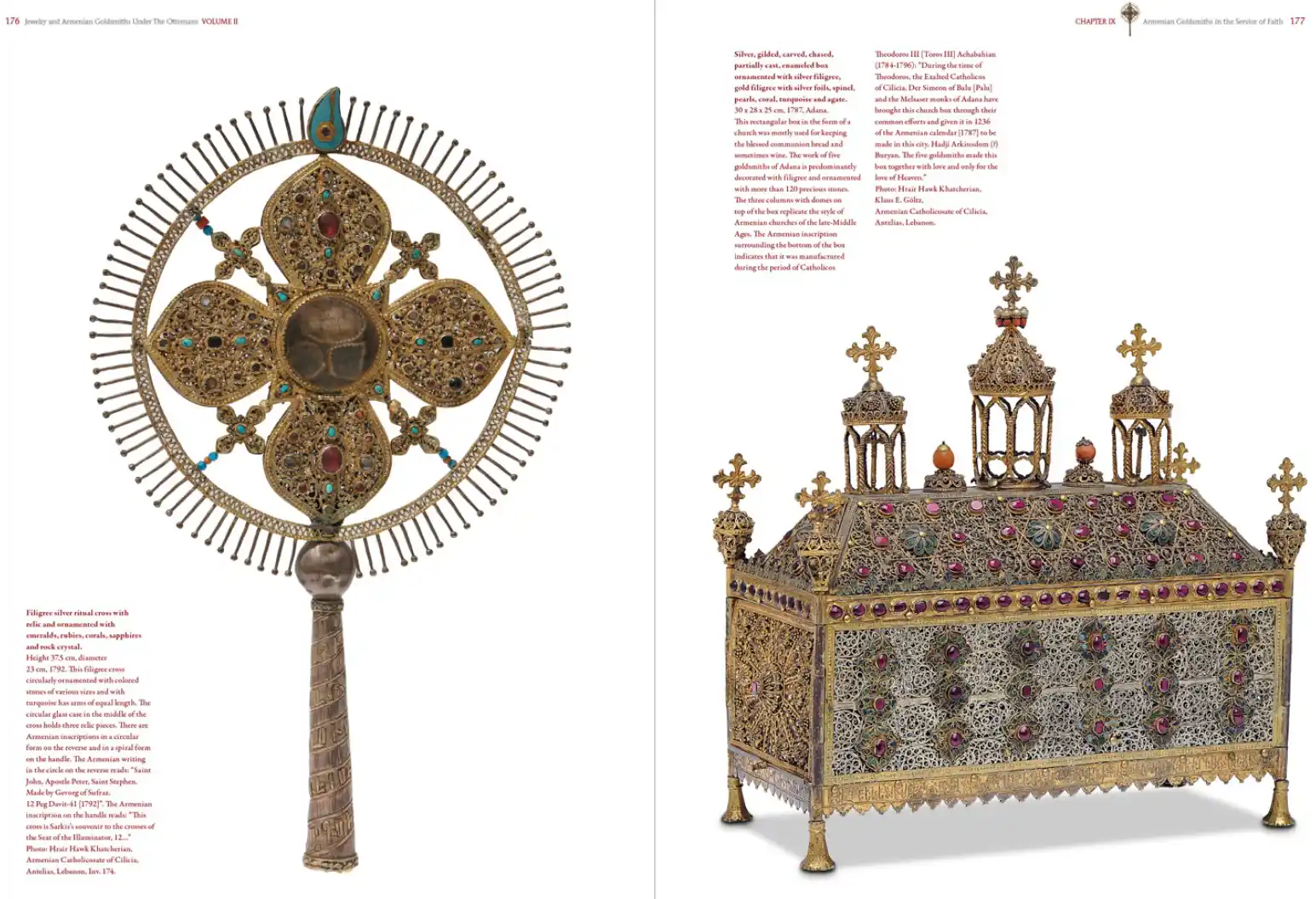 gold filigree with silver foils, spinel, pearls, coral, turquoise and agate. 30 x 28 x 25 cm, 1787, Adana. This rectangular box in the form of a church was mostly used for keeping the blessed communion bread and sometimes wine. The work of five goldsmiths in Adana is predominantly