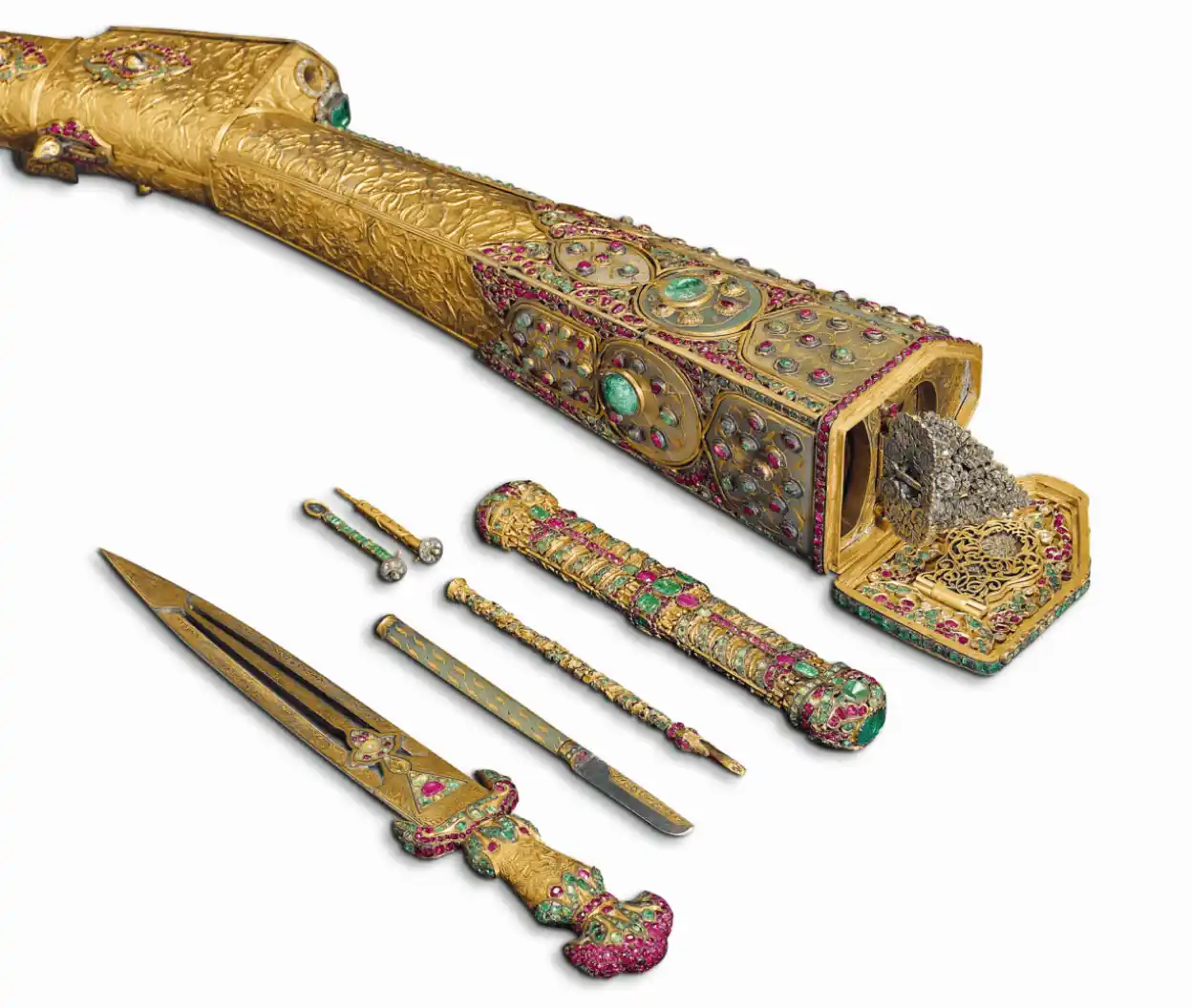 Of course, there are countless. Religious objects symbolising ethereal feelings and magnificent aigrettes are very impressive. Hovhannes Düz’s bejewelled decorations on the rifle manufactured for Mahmud I are extraordinary. Abdülhamid II’s jewelery that was sold at an auction in Paris in 1911 is very important as all but a few of them were made in Istanbul. I like the emerald brooch surrounded by diamonds which Mahmud II gifted to Queen Victoria, and the sketch samples of the pieces made by Düzoğlu Hoca Hagop to the Queen of Spain, because they give an idea about the exchanges of diplomatic gifts. The Armenian wedding gold manufactured in the mid-18th century at the Imperial Mint is among the rarer works. The lotus flower shaped brooch sold to Cartier by the antique dealer Kalebdjian Brothers or the silver vase made by Apik Unciyan, which was commissioned by Nigoğos Çizmeciyan for the 25th enthronement anniversary of Abdülhamid II, are impressive. I am also personally very moved by the pendant consisting of a crescent and a cross with four leaves and diamonds set in white gold, as an expression of the religious diversity in the Ottoman Empire.