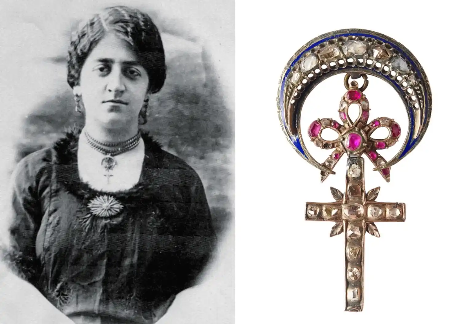 The crescent edged with blue enamel is white gold and studded with diamonds. Below is the ruby studded bow-shaped middle section, which links the crescent to the diamond studded cross featuring four leaves. This rare necklace alludes to the religious diversity in the Ottoman Empire. It was gifted Yepraksi Pekmezciyan by her mother Güline Pekmezciyan as a wedding gift and it was crafted by Güline Pekmezciyan’s father, who was a goldsmith. The owner of the necklace, Yepraksi Pekmezciyan, was later to change her name to Çakırer upon her marriage. The photograph of the necklace is provided by Vrej-Ümit Çakırer, son of Yepraksi Pekmezciyan. Photo: Bahadır Taşkın