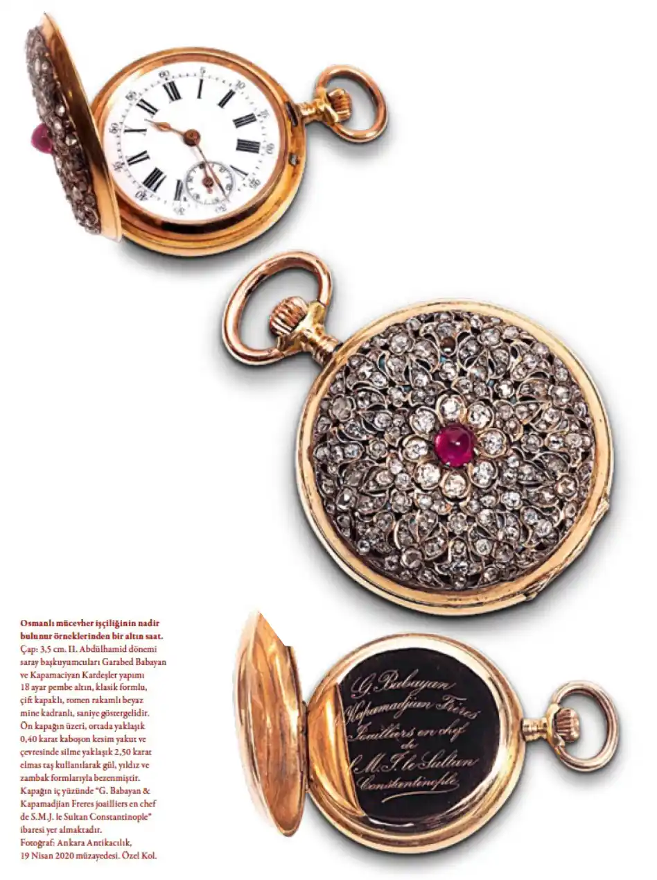 Diameter: 3.5 cm. Manufactured by Garabed Babayan and the Kapamadjian Brothers, chief palace goldsmiths during the reign of Abdülhamid II. 18 carat pink gold, classical form, twin-lidded, Roman numerals, white enameled dial, seconds hand. The front lid is decorated with a 0.40 carat cabochon-cut ruby in the center, surrounded by rose, star and lily patterns made by using approximately 2.50 carats of diamonds. The inner face of the lid is inscribed “G. Babayan & Kapamadjian Frères joailliers en chef de S.M.J. le Sultan Constantinople”. Photo: Ankara Antikacılık, 19 April 2020 Auction. Private Col.